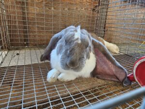 Children stand in a line inside a barn, each with a goat on a red table. They appear to be preparing for a goat show or competition. The barn is decorated with blue and red balloons, and there are other goats visible in the background.A rustic barn with open sides houses rows of small animal cages on raised tables. The cages contain various small animals, including rabbits and guinea pigs, with food and water. A colorful sign reading